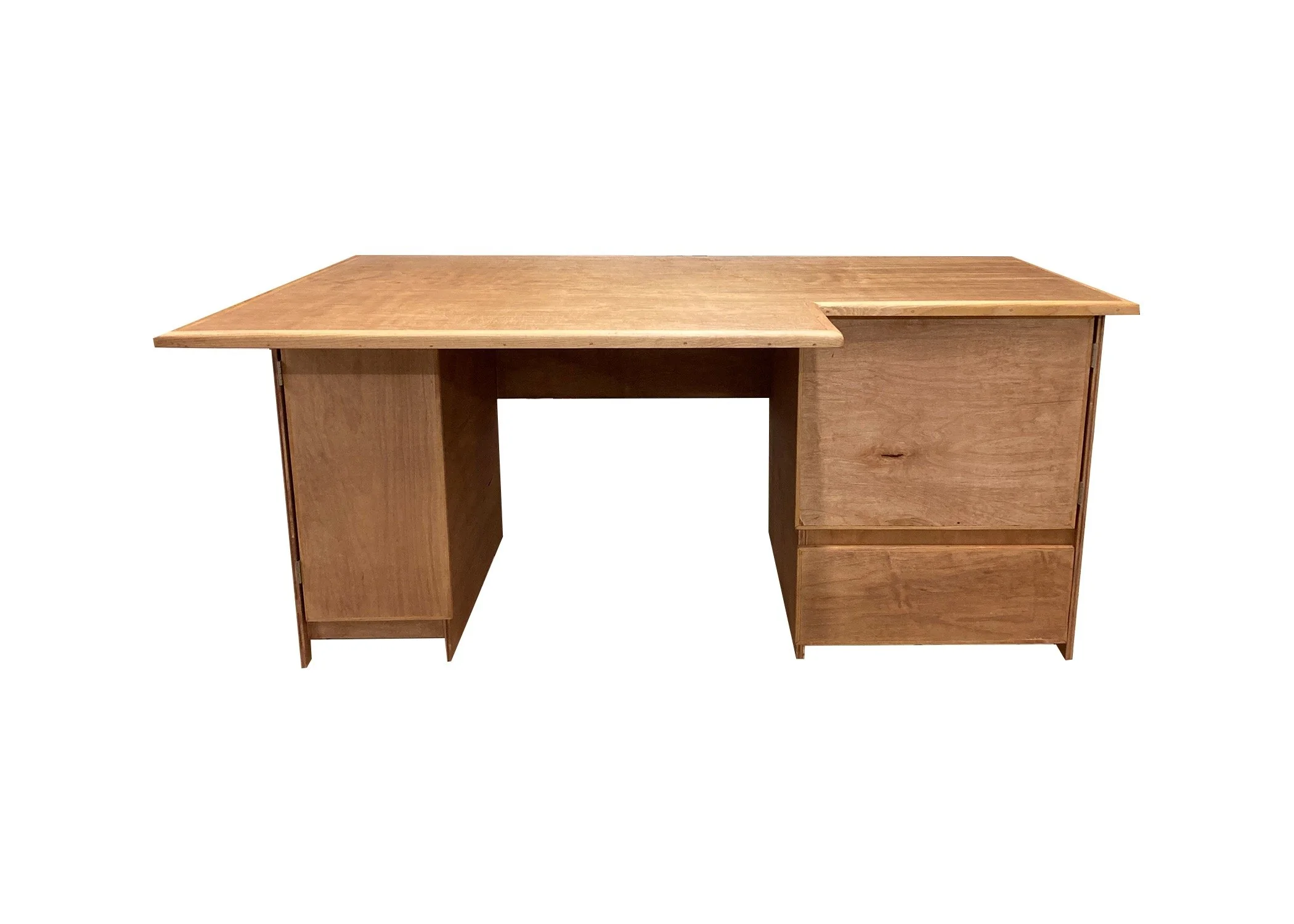 This desk was built for a customer who is self employed and works from home. He had an old IKEA desk that was falling apart. He asked for this completely custom setup. From the exact height to work with his glasses, to the exact width to fit between his cabinets and the perfect compartment for his monitor. He was very pleased with his new desk!