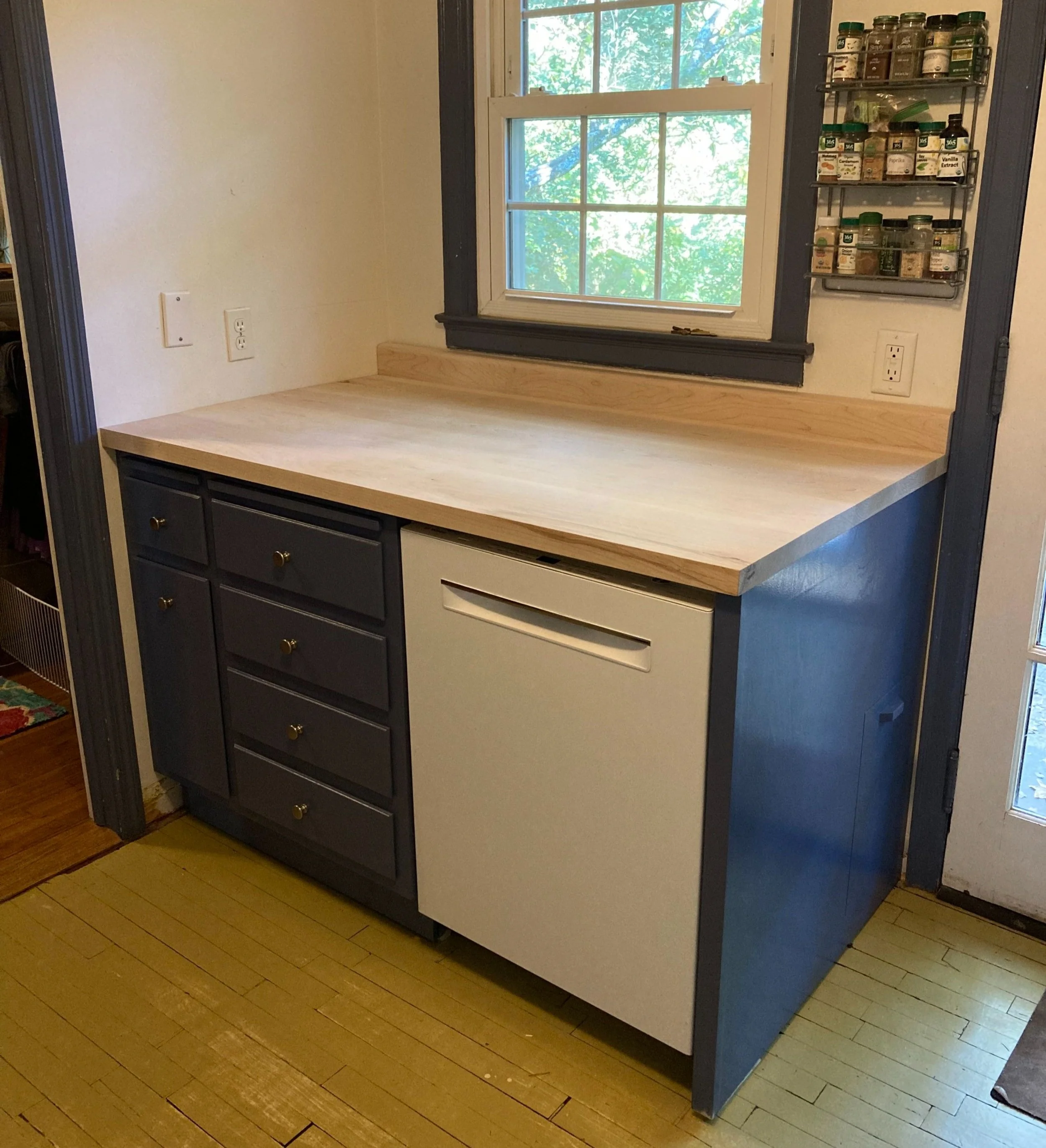 The before and after really says it all! This client was pressed for space and had an old cabinet that had never even been attached to the wall! This led to all sorts of spills and lost things falling between the cabinet and the wall. The old cabinet didn’t function well, the low-end hardware was on it’s last leg and the particle board cabinet had one foot in the grave. However, the client really liked the layout of the cabinet, so after multiple 3D iterations we decided to stick with the layout that they were used to but make it better than ever. We increased the drawer sized as much as possible while remaining faithful to the original layout, upgraded to top of the line Blum drawer slides and finished it with the best paint you can buy. The biggest upgrade with the extra deep, solid Hard Maple countertop. Hard Maple is a domestic hardwood and is even harder than Oak! We also made the cabinet as deep as we could fit in this space, this not only gave the clients way more countertop space but also made all the drawers deeper. We used Baltic Birch plywood, which is known as some of the best plywood in the world and puts most cabinet grade plywoods to shame with it’s strength and stability. You can see other features here include a pull out spice rack and a toe kick drawer, as well as an access panel at the back of the dishwasher.